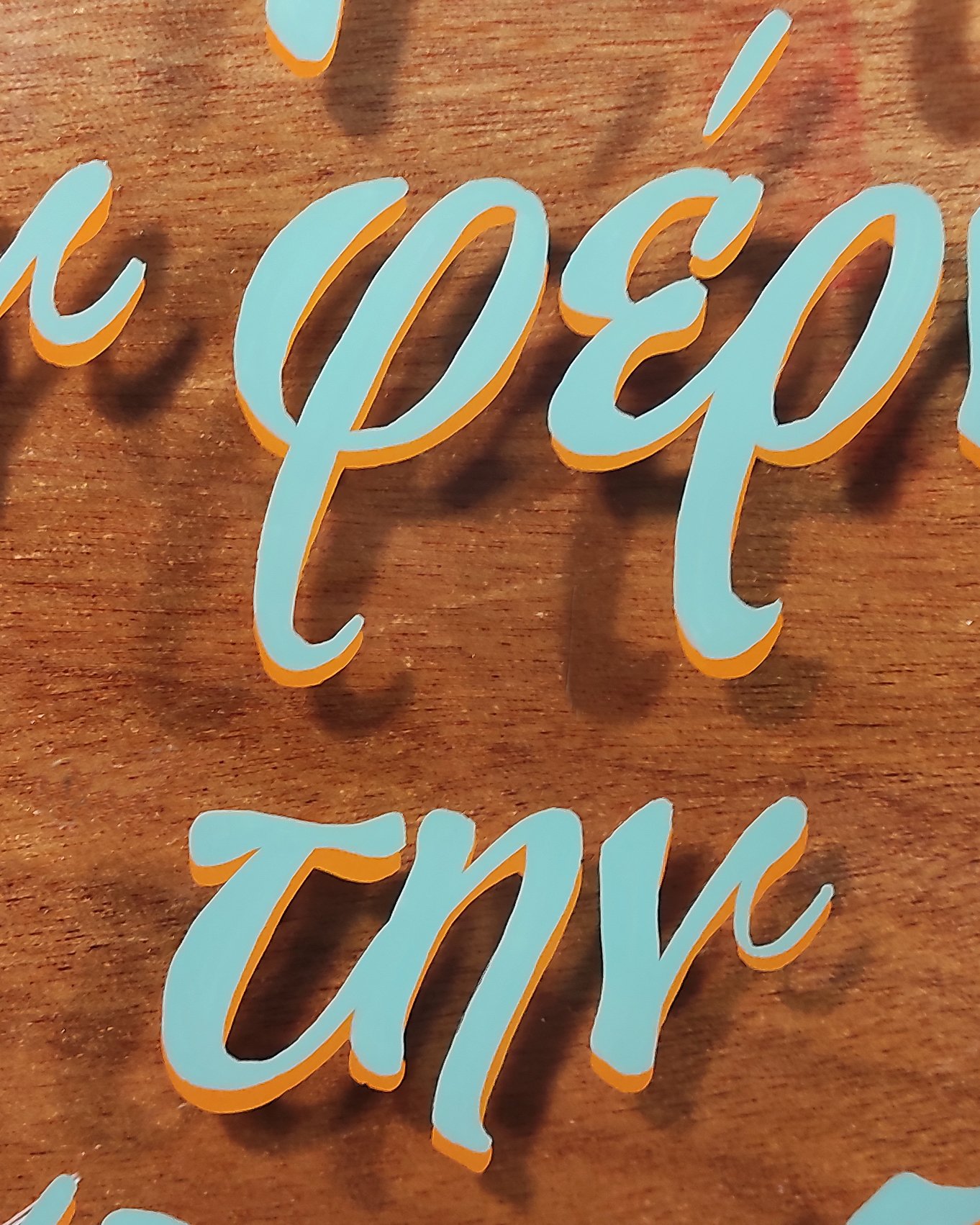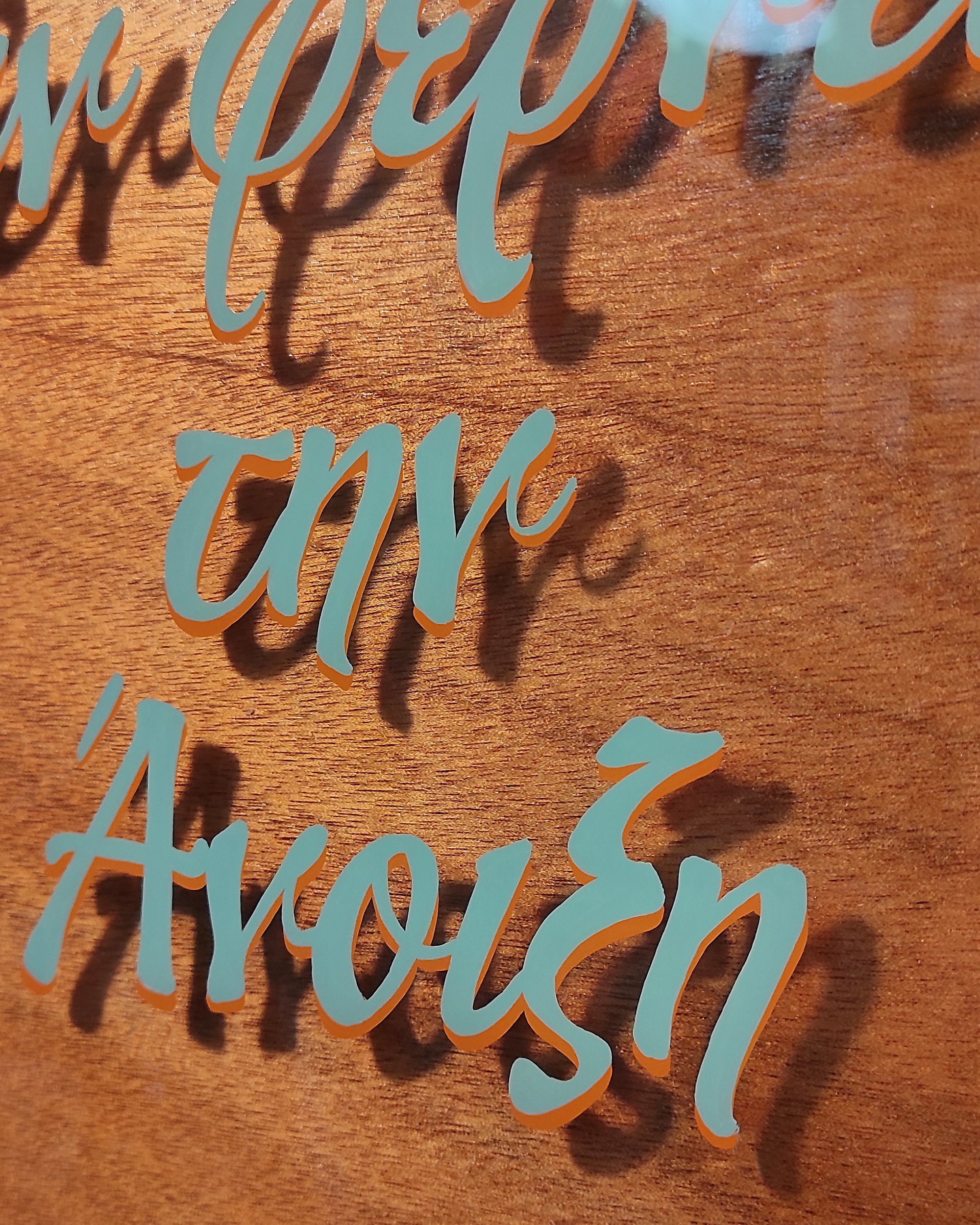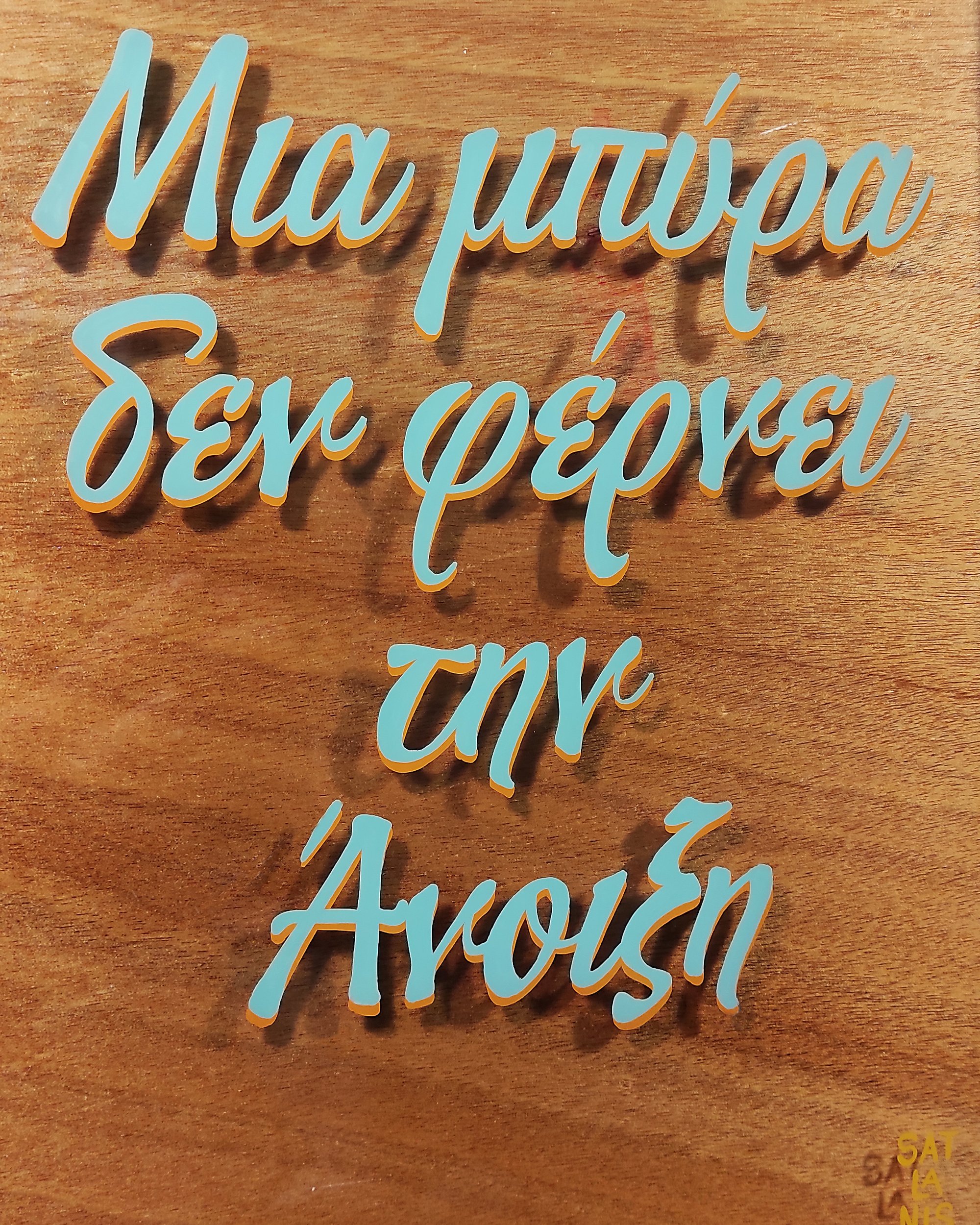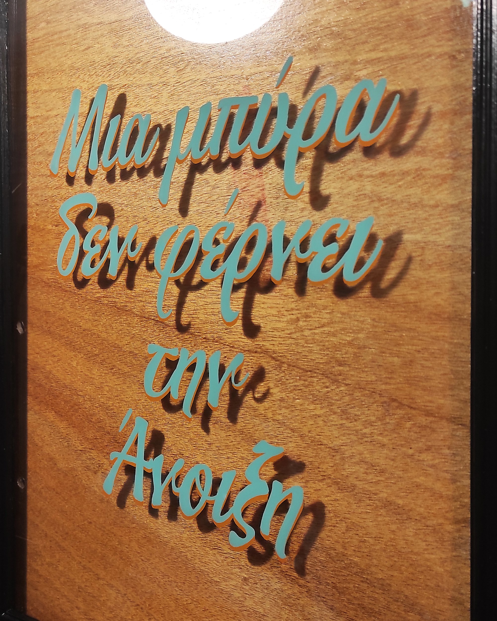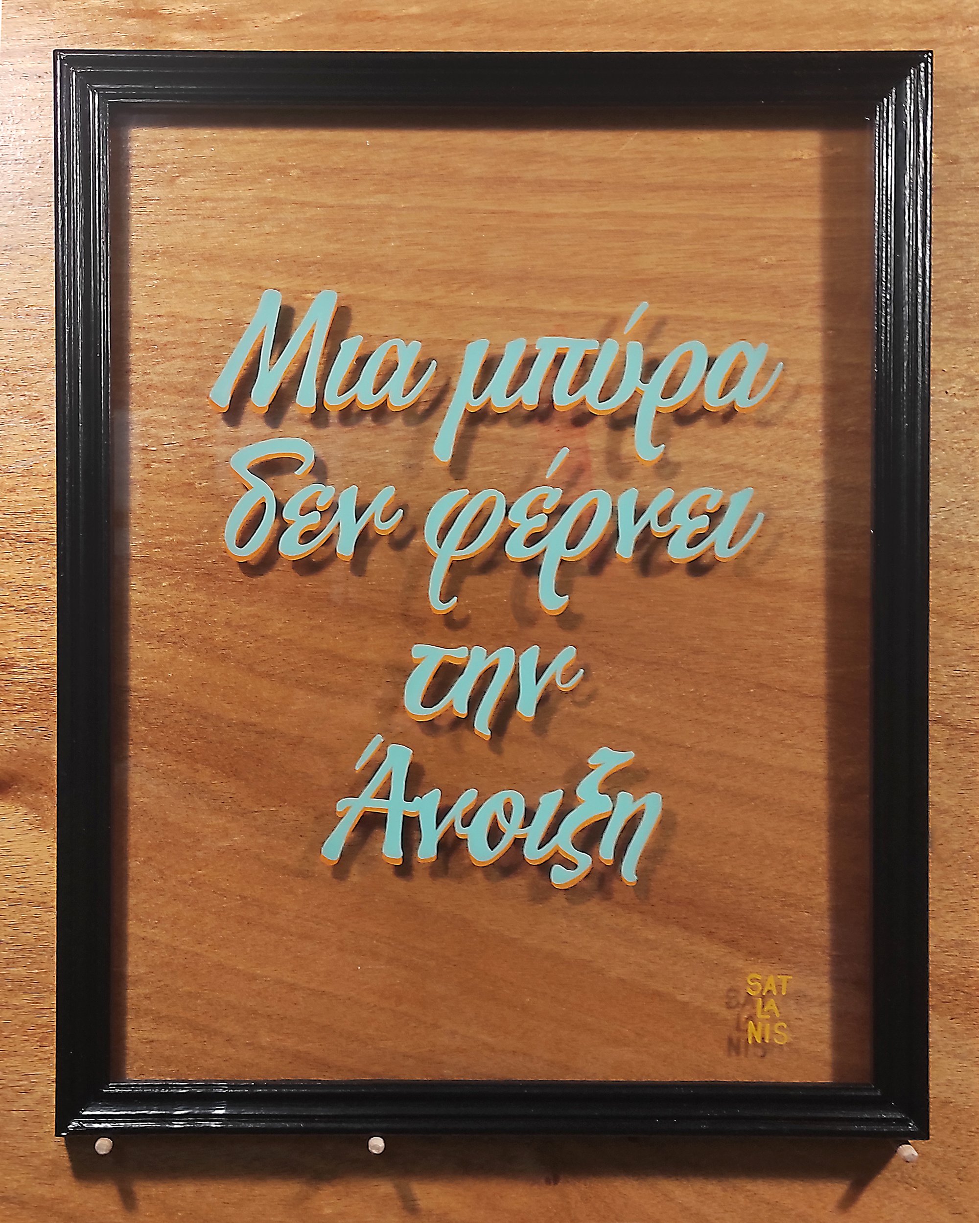 Hand-painted on glass from an old IKE@ frame, this piece features a playful twist on a classic Greek proverb: