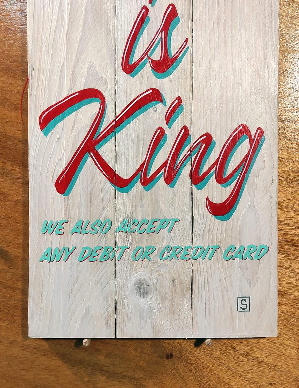 Handcrafted from reclaimed wooden boards using enamel colors.