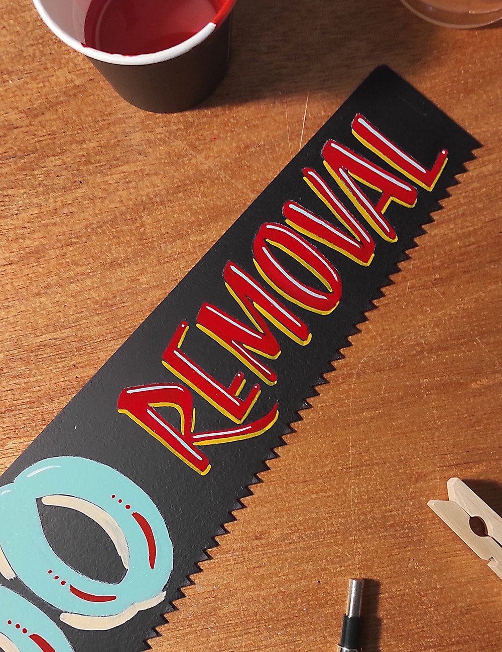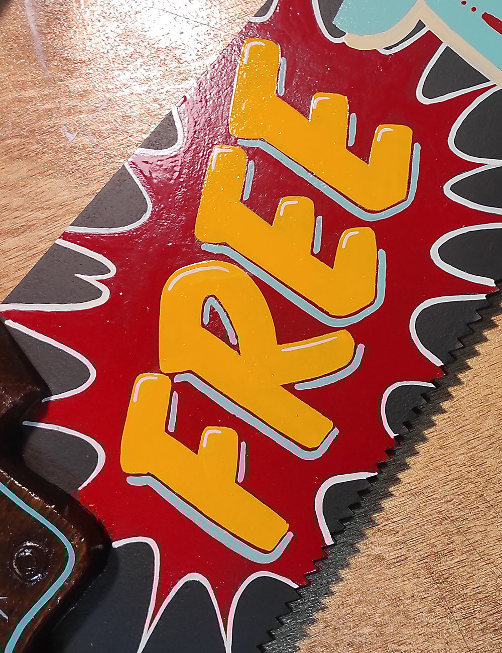 Παλιό χειροπρίονο, ζωγραφισμένο στο χέρι με enamel χρώματα, εμπνευσμένο από την old-school αισθητική και το χιούμορ άλλων εποχών.