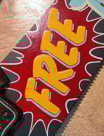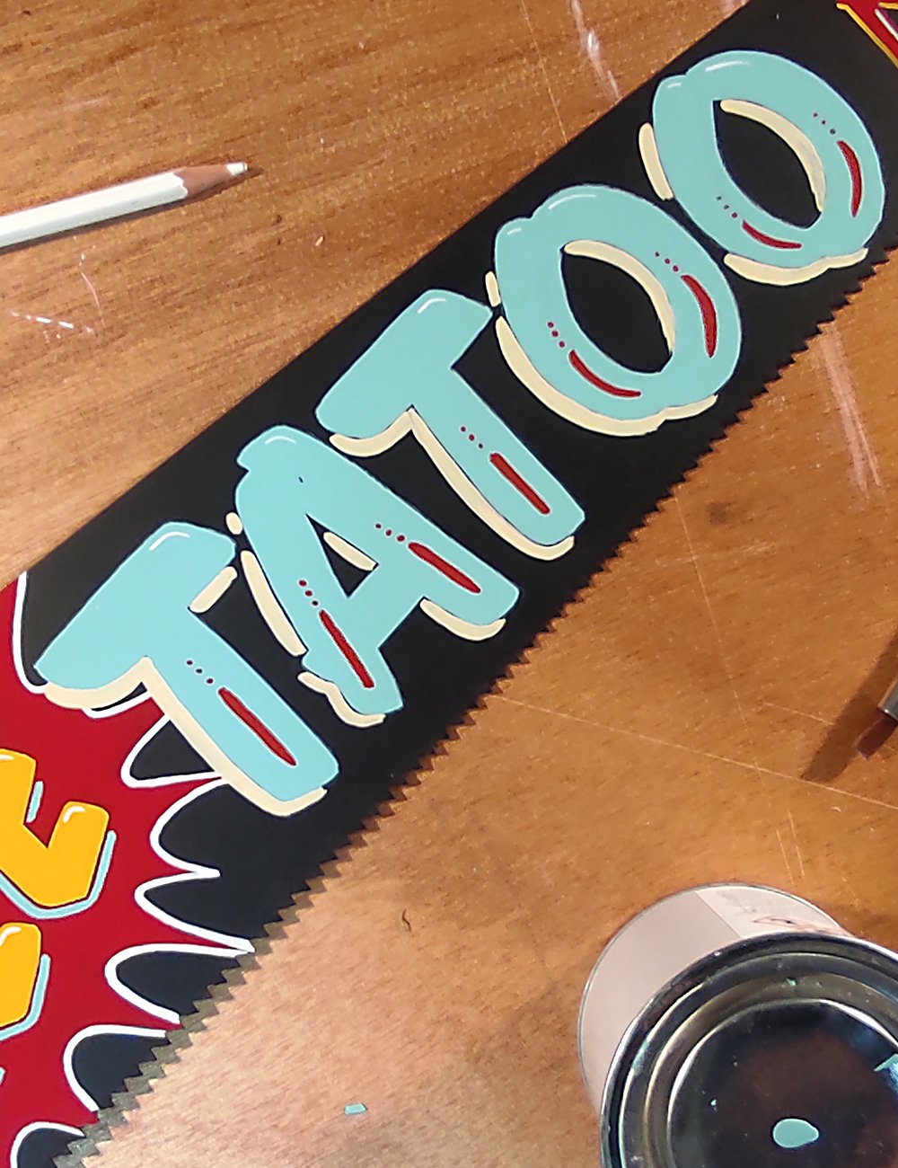 An old handsaw, hand-painted with enamel colors, inspired by old-school aesthetics and the humor of another era.
